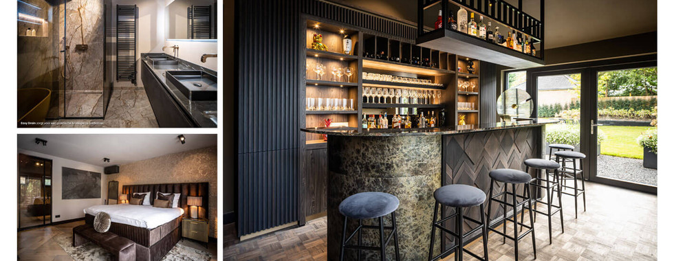Het kookeiland en de kasten zijn niet over the top, maar functioneel en uitgevoerd in zachte en warme kleuren. De huisbar is een ruimte geworden om bezoekers te ontvangen of om samen iets te vieren. De champagneflessen staan er niet voor niets. De living houdt het midden tussen een zitkamer en een huiscinema, want dankzij de combinatie van comfortabel meubilair en een levensgroot scherm kan ze in een handomdraai veranderen in een privébioscoop.